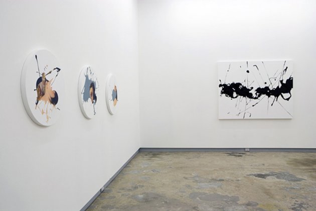 This is in keeping with the researcherly way in which Smiedt has been working. Her previous exhibitions included an array of drip studies, tabulated by form and color. By comparison, this study is more focused. There are fewer variables for example. The palette has been minimized to grayscale, apart from the humanizing flesh tone - though the process of enlargement reveals the multitude of colours at work in any apparently simple and uniform colour: blues and greens shine out where black paint thins for example.